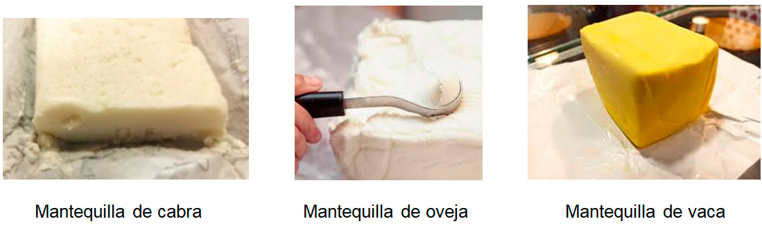 La mantequilla de cabra y oveja, en cambio son de tonos blanquecinos. Esto se debe a que, aunque estos animales también son rumiantes, la grasa de su leche contiene en lugar de la provitamina A, es decir beta-carotenos coloreados, la vitamina A incolora, y por lo tanto, al batir esta grasa para elaborar mantequilla esta es más pálida, pero igual de nutritiva y sabrosa que la de vaca. Esto se debe a que las cabras y ovejas, por una parte, poseen una alta actividad de la enzima BCMO1, por otra parte, suelen ingerir menos beta-carotenos que las vacas, especialmente las cabras, porque estas se alimentan preferentemente de arbustos y vegetación menos rica en estos compuestos. Por lo tanto, no almacenan estos pigmentos como los bóvidos, sino que los transforman en vitamina A, y al ser esta incolora, tanto la mantequilla cabra como la de oveja tienen un color pálido o blanco.