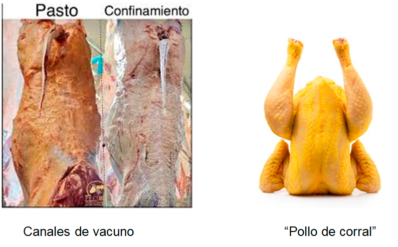 Hay productores que tratan de superar este problema mediante el confinamiento de sus animales durante algunos meses previos al sacrificio, lo que no siempre suele ser efectivo, aparte de disminuir la calidad de la carne y de su valor nutricional. Curiosamente, el pollo nos gusta que tenga una pigmentación amarillo-anaranjada de la piel y de la grasa, el típico “pollo de corral”, lo asociamos a que el animal ha tenido una ”vida más felíz”. Con ese propósito los avicultores suplementan la alimentación de estas aves con diversos productos que contienen oxicarotenoides, y al tener estos poca actividad de la enzima BCMO1 consiguen un color más intenso, que el consumidor asociará a una dieta más natural y de mayor calidad. Sin embargo, en la carne de vacuno no nos gusta ese color y preferimos que su grasa sea de color blanco. Convendría que tuviésemos en cuenta, que en estos animales los carotenoides se depositan de manera natural, cuando consumen una excelente dieta de forrajes verdes.