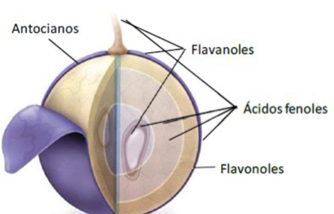 Los polifenoles son las principales moléculas cromóforas y consecuentemente las responsables del color, tanto de la uva como de los vinos, pero son además unos potentes antioxidantes. En general, el color característico de los vinos blancos lo aportan los polifenoles responsable de su color amarillo y el de los tintos los polifenoles del rojo. Estos polifenoles, a la vez de aportar colora los vinos, les proporcionan aspereza, astringencia y complejidad.