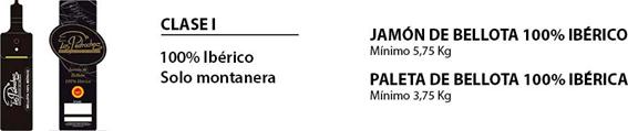 Clase I: Son jamones o paletas obtenidos de cerdos 100% ibéricos cuyo engorde final,antes del sacrificio, se ha realizado en montanera a base de bellotas y hierba exclusivamente. Esta categoría se corresponde con las piezas de mayor calidad.