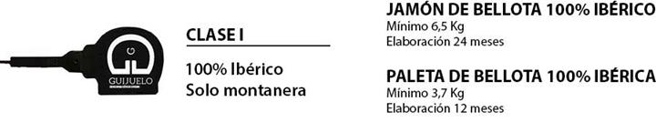 Clase I: Jamón de bellota 100 % ibérico: procedentes de cerdos 100 % ibéricos que cumplen los requisitos de alimentación indicados en la descripción del producto como de cerdo de bellota o terminado en montanera, es decir el cerdo que se destina al sacrificio inmediatamente después del aprovechamiento exclusivo de bellotas, hierba y demás recursos naturales de la dehesa, sin posibilidad de alimentación suplementaria