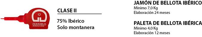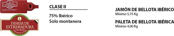 Clase II: Corresponde a las piezas obtenidas de cerdos con un 75% de pureza genética de la raza ibérica, cuyo engorde final, anterior al sacrificio, se realiza en las dehesas a base de bellotas y hierba exclusivamente.