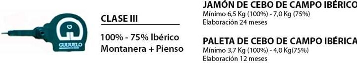 Clase III: Jamón de cebo de campo 100 % ibérico: procedentes de cerdos 100 % ibéricos que cumplen los requisitos de alimentación de cerdo de cebo de campo: Es aquél cuya alimentación en su fase de engorde se lleva a cabo mediante el aporte de piensos, constituidos fundamentalmente de cereales y leguminosas, cuyo manejo se realice en explotaciones extensivas y que completan su alimentación mediante una estancia mínima en campo de 90 días hasta el momento del sacrificio.