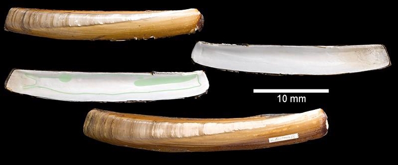 Esquema de las conchas de las navajas (Ensis ensis y Ensis magnus), longueirón (Ensis siliqua) y longuerión vello (Solen marginatus)