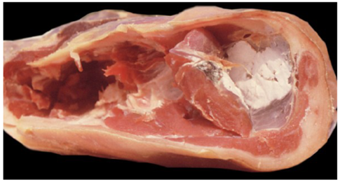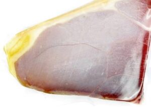 No debemos confundir el velo blanco del jamón, que aparece a veces en la superficie de corte del jamón, con un moho. Figura 4. Se trata de un precipitado del aminoácido, tirosina, el más insoluble de todos los aminoácidos, y que precipita de forma uniforme sobre toda la superficie al haberse eliminado agua durante el secado. Suele aparecer, sobre las lonchas, al cabo de pocos días de ser envasado al vacío, o bien sobre el corte del jamón. La presencia de este velo depende en gran medida del grosor de la loncha, siendo superior y más frecuente en lonchas gruesas que en finas. Aunque se considera un defecto por el impacto visual que produce, en absoluto supone un peligro, tener en cuenta que la tirosina es un aminoácido que calificamos de semiesencial y es altamente recomendable.