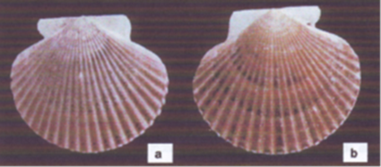 El número de costillas radiales de las valvas de la volandeira está comprendido 19-22. En la vieira del pacifico el número costillas está comprendido entre 23 y 29, estas son anchas, lisas y almenadas. Las valvas de las zamburiñas tienen entre 25 y 35 costillas radiales, generalmente 28,y contienen numerosos anillos de crecimiento concéntricos, poseen numerosas espinas espatuladas o laminillas erizadas que son más visibles y están más desarrolladas en los bordes.