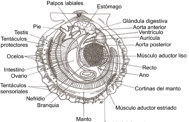 Dentro de la concha bivalva se encuentran las partes blandas que están comprimidas lateralmente y recubiertas por un tejido más externo que recubre la superficie interna de la concha que se denomina manto, donde se repiten ciertos órganos internos similares a los que presentan los animales superiores. En el siguiente esquema y figura se detallan los órganos internos y sus posiciones.