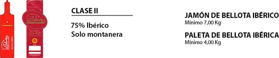 Clase II: Corresponde a las piezas obtenidas de cerdos con un 75% de pureza genética de la raza ibérica, cuyo engorde final, anterior al sacrificio, se realiza en las dehesas a base de bellotas y hierba exclusivamente.
