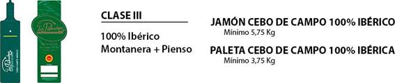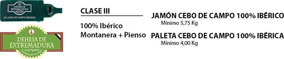La Clase III corresponde a las piezas obtenidas de cerdos 100% ibéricos cuyo engorde final, antes del sacrificio se realiza en régimen extensivo en las dehesas a base de las sustancias naturales propias de esas dehesas y piensos naturales de cereales y leguminosas.