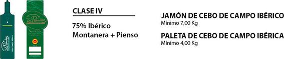Clase IV: Jamón de cebo de campo ibérico: procedentes de cerdos 75% ibéricos que cumplen los requisitos de alimentación indicados en la descripción del producto según el apartado cerdo de cebo de campo.