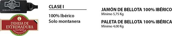Clase I: Jamón de bellota 100 % ibérico: procedentes de cerdos 100 % ibéricos que cumplen los requisitos de alimentación indicados en la descripción del producto como de cerdo de bellota o terminado en montanera, es decir el cerdo que se destina al sacrificio inmediatamente después del aprovechamiento exclusivo de bellotas, hierba y demás recursos naturales de la dehesa, sin posibilidad de alimentación suplementaria