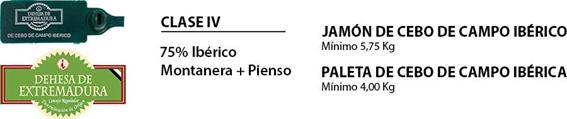 La Clase IV corresponde a las piezas obtenidas de cerdos con un 75% de pureza genética de la raza ibérica cuyo engorde final, anterior al sacrificio, se realiza en régimen extensivo en las dehesas a base de las sustancias naturales propias de las dehesas y piensos naturales de cereales y leguminosas.