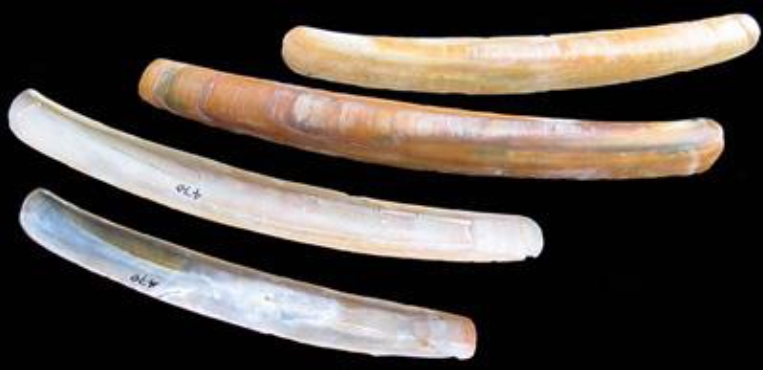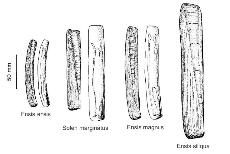 Esquema de las conchas de las navajas (Ensis ensis y Ensis magnus), longueirón (Ensis siliqua) y longuerión vello (Solen marginatus)