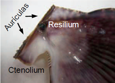 Lo que diferencia a los pectínidos del resto de moluscos bivalvos es un ligamento gomoso de color negro,la charnela, o resilium, que se encuentra al borde de las valvas. Se trata de un ligamento elástico que actúa como bisagra y permite a través del musculo aductor abrir y cerrar las valvas; por otra parte, poseen y una hilera de dientes denominado ctenolium que se encuentra situado de la hendidura bisal de la valva derecha, por donde salen al exterior los filamentos denominados biso. El biso son unos filamentos que secreta una glándula situada en el pie, que se endurece al contacto con el agua y que les permite fijarse a una superficie.