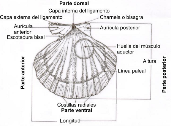 Dentro de la concha bivalva se encuentran las partes blandas que están comprimidas lateralmente y recubiertas por un tejido más externo que recubre la superficie interna de la concha que se denomina manto, donde se repiten ciertos órganos internos similares a los que presentan los animales superiores. En el siguiente esquema y figura se detallan los órganos internos y sus posiciones.