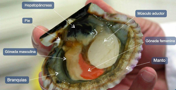 Las especies de pectínidos comentados son hermafroditas (un organismo presentan los dos sexos, masculino y femenino). Las gónadas están unidas a la parte anterior del músculo aductor. Cuando las gónadas están madura se diferencian claramente dos zonas: una testicular de color blanco o ligeramente amarillenta ubicada en la parte anterior y una ovárica de coloración naranja intenso o rojo ubicada en la parte posterior, excepto en la zamburiña que la parte ovárica su coloración es muy tenue.