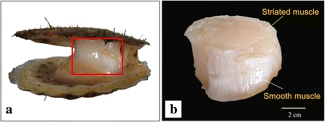 El musculo aductor se divide en dos partes una parte estriada que constituye un aductor rápido, y otra parte lisa o aductor lento que tienen diferentes propiedades contráctiles. Estos músculos se encuentran muy juntos entre sí por lo que aparentan un solo músculo. El aductor estriado se contrae muy rápidamente para nadar, mientras que el aductor liso se contrae durante períodos prolongados, manteniendo las conchas cerradas con poco gasto de energía.